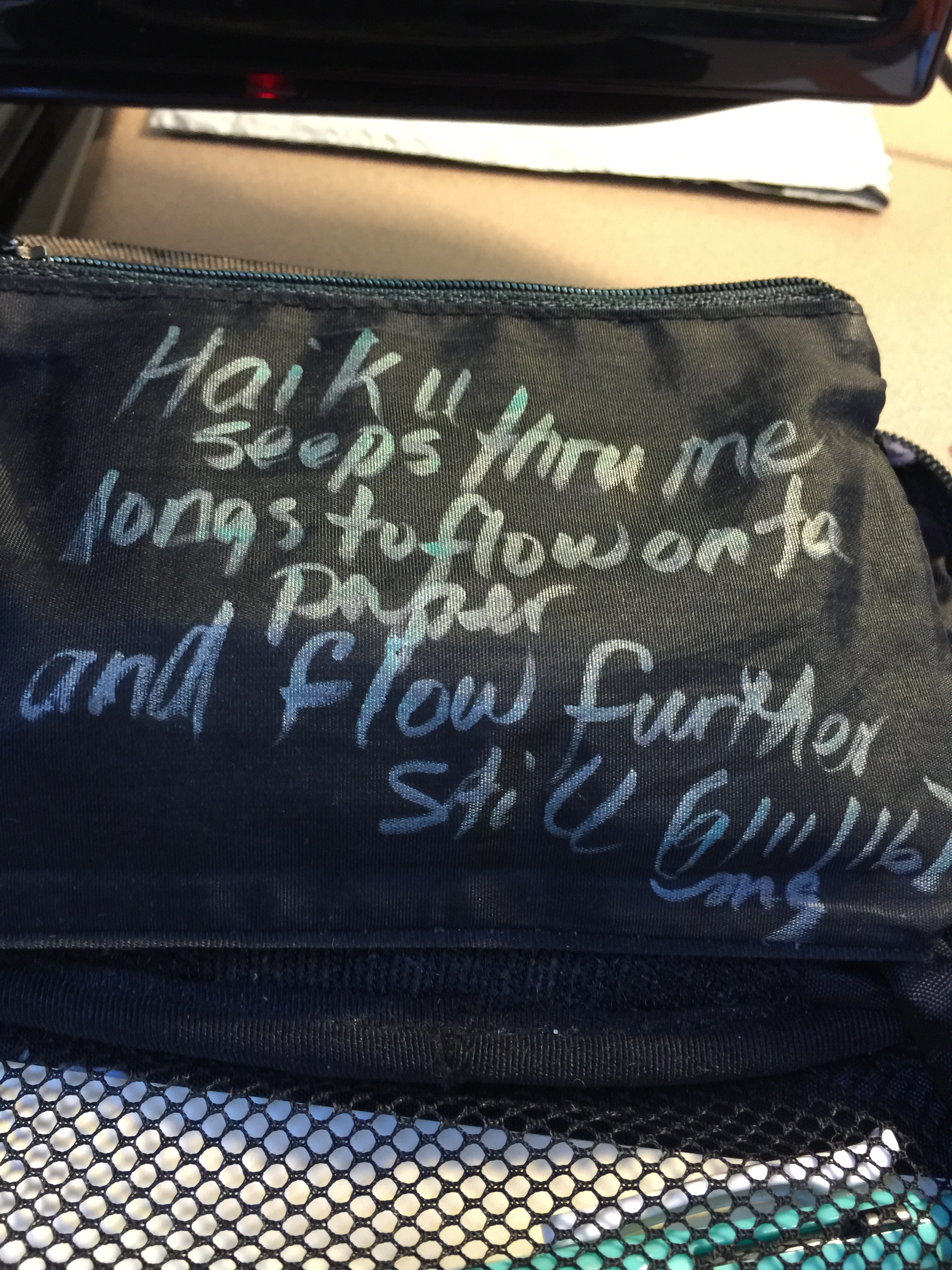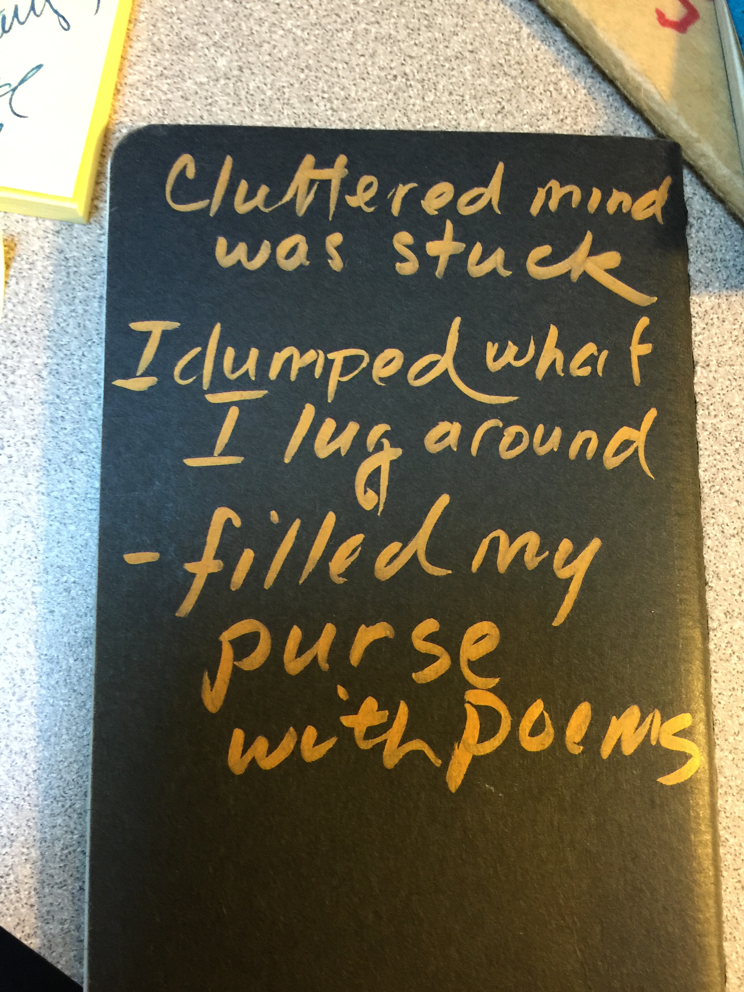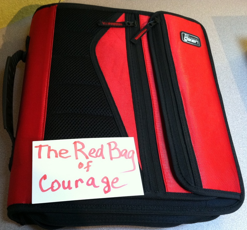 But it was all the poetry that clamored to be put on paper with purple fountain pen ink that shouted the loudest. My answer to dealing with all of those critters who must be fed is what I called my Red Bag of Courage: a large zipped binder with sections for portions of several projects. Sometimes you’ve just gotta hand-write a note instead of typing onto the iPad. After I could carry it . . it was going to include new poetry I’d written, blog ideas, etc. I was inspired again.