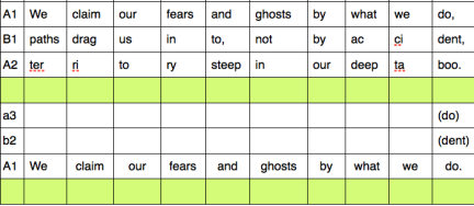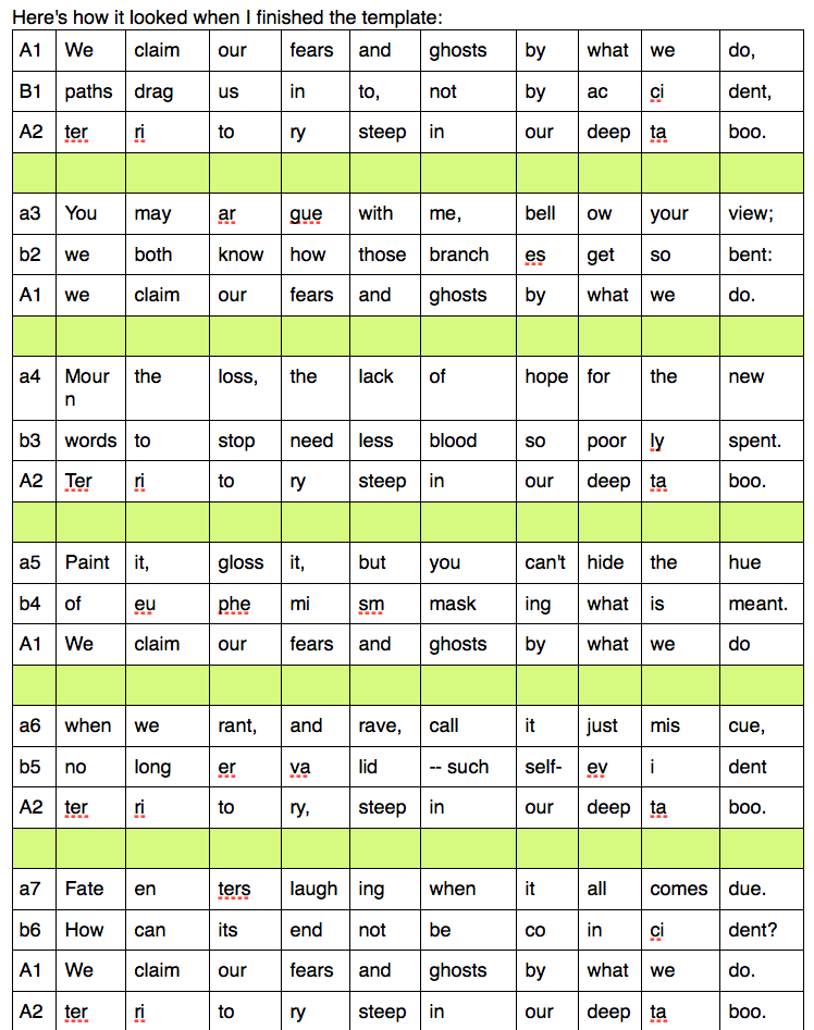 6. Filled in each of the first three rows, one syllable per each cell across the table, in columns 2 – 11, with my first tercet.