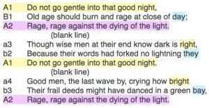 1. Took as my guide the Dylan Thomas poem “Do Not Go Gentle Into That Good Night”, which Margaret used when she introduced the form.