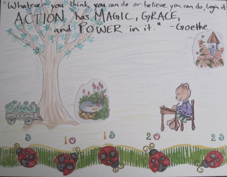 Today begins a new year, a new Age. A time for re-evaluations, making new goals and adjusting old ones. I, for one, didn’t do very well on the goals I set in 2012. Rather than do a repeat, with likely similar results, I’m changing the way I make changes. I’m taking it from the verbal to the visual. I saw some pretty butterfly stickers at WalMart and snagged them as the basis of my reward sheet. I pulled out all my scrapbook and craft supplies, and came up with this: