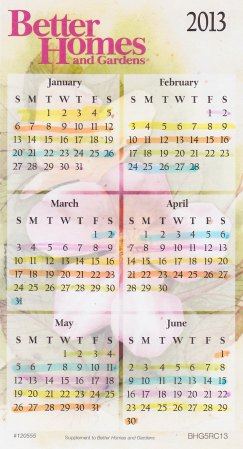 The other thing I’m taking from FlyLady is Zones. I tweaked her list a bit to come up with my own personalized House Zones. 5 Zones to cover the entire house. One zone per week, so every five weeks I’ve given attention to each part of the house. If I do a minimum of one cleaning session (15 minutes!) each day, with one day off, that’s an hour and a half cleaning in each zone. Depending on the room, I could be spending that time decluttering, or deep cleaning, or organizing. I got a little calendar from BHG. I highlighted each week in a different color for different zones.