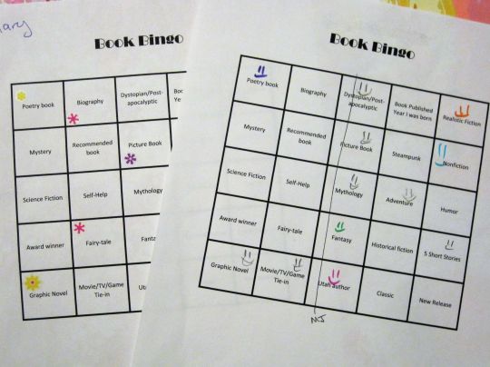 We started after school got out, so have been working on them for a month now. I am awarding a treat or small prize for a bingo, and a book of his choice for a full blackout (all spaces filled). I am participating in it as well, more for the challenge than prizes. 25 books in 13 weeks is a lot of reading, but doable. We are running the challenge until school starts. At that point, he can no longer earn bingos, but can still work toward blackout.